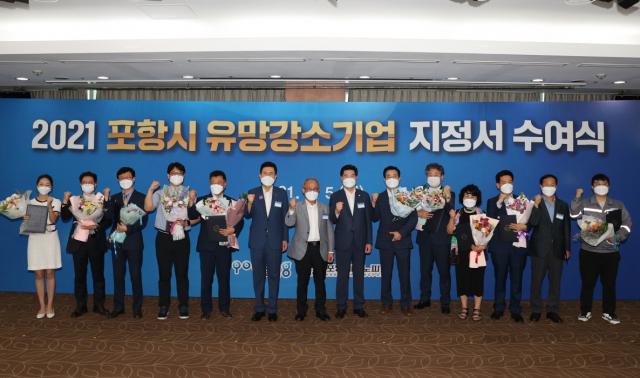 ▲ 포항시가 2021년도 유망강소기업 지정서 수여식을 개최하고 기념촬영을 하고 있다. ⓒ 포항시 제공